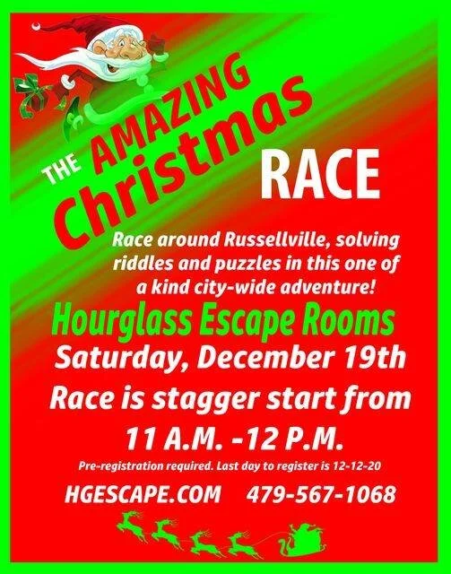 Are you ready to get your team together for Russellville's Amazing Christmas Race? Race around town solving puzzles and riddles in our second annual Amazing Christmas Race. This years race will be stagger start from 11:00am to 12:00pm Registration fee is $50 per team